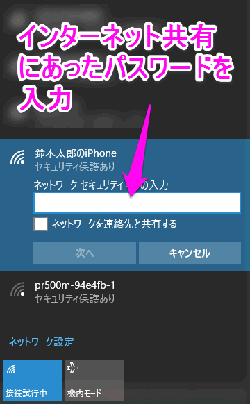 先ほどiPhoneのインターネット共有の設定画面で表示された"Wi-Fi"のパスワードを入力します。