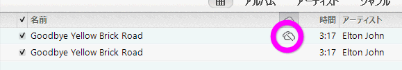 別のパソコンに存在しない音楽ファイルで、iCloudにアップロードされている場合は、このようなマークになります。