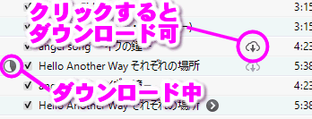 雲のアイコンが表示されている曲は、まだiPhoneにはダウンロードしていない曲、という意味です。この雲のアイコンをタップするとダウンロードが開始されます。