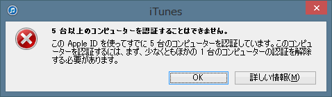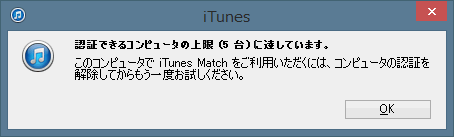 パソコンなどを5台以上所有していて、6台以上をiTunes Matchで認証しようとするとこのようなエラーになるようです。