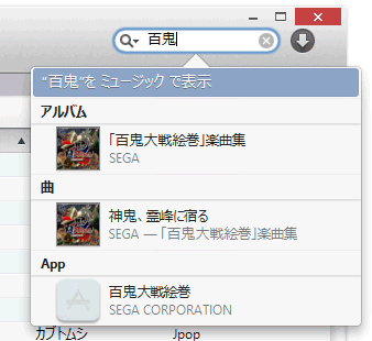自宅のデスクトップのみしか保存されていない曲を、会社のノートパソコンで検索すると、Matchをオンにする前は見つかりませんでした(表示されているのはアプリ)。