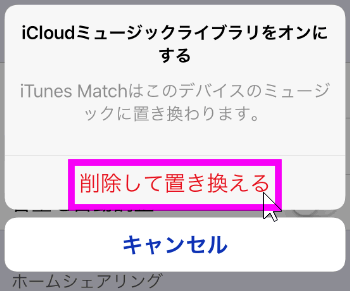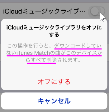 「ダウンロードしていないiTunes Matchの曲がこのデバイスからすべて削除されます」と書かれています。