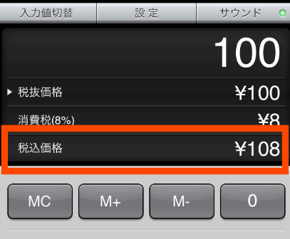例えば、税率5%で「税抜き」設定にした状態で「 100 」と入力すると、即座に「税込価格」に105と表示されました。