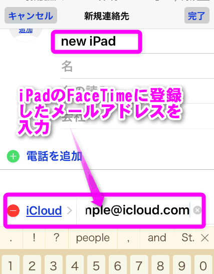 次に、iPhoneやiPadに電話してほしい相手に、iPad用の連絡先を登録します。