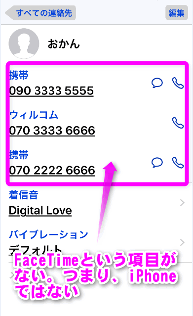 連絡先にこの「FaceTime」という項目がある場合、相手はiPhoneを使っています。