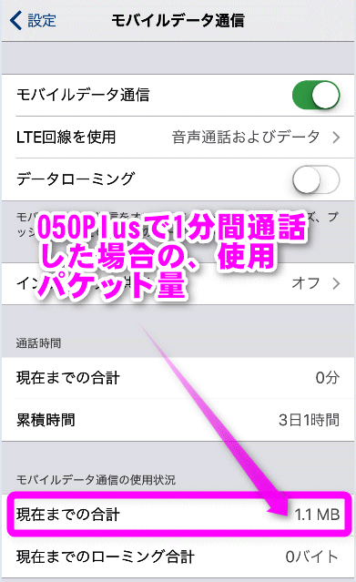 050Plusで1分間通話した時の、使用したパケット量では、約1.1MBでした。