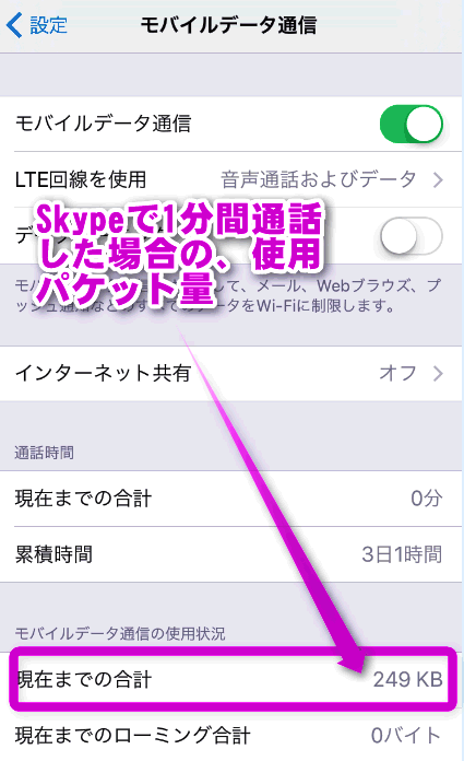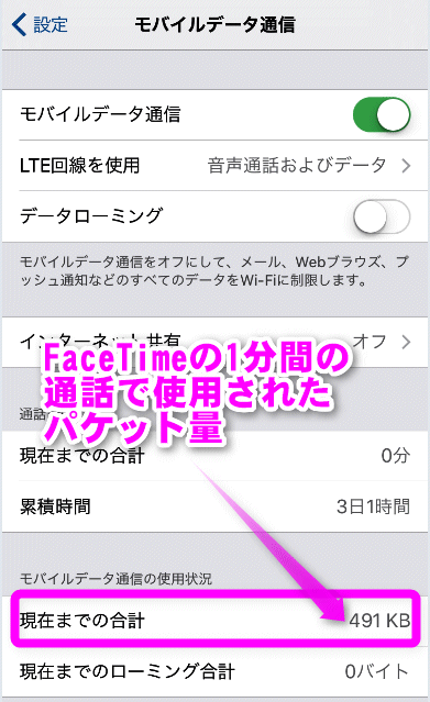 携帯電話回線を使って1分間、FaceTimeの映像通話をした時のパケット使用量は、なんと2.5MB/分でした。