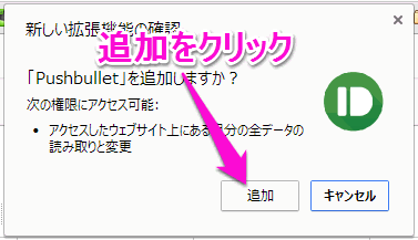 Chromeに追加していいか聞いてくるので、「追加」をクリックします。