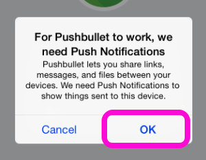 Pushbulletを使うには通知を許可してください、というような警告が表示されるので、OKをタップします。