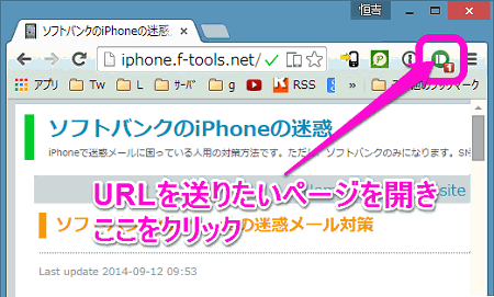 パソコンで見ているページをスマホ(iPhoneを含む)に送信するには、送りたいページをChromeで表示させ、右上のPushbulletのボタンをクリックします。