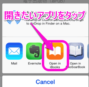 今回はEPUB形式のファイルだったので、「Open in iBooks」をタップ。
