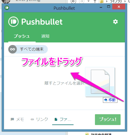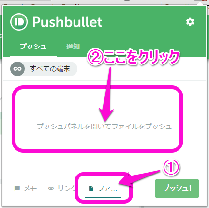 同じようにChromeからPushbulletを開き、①下の「ファイル」をクリック。