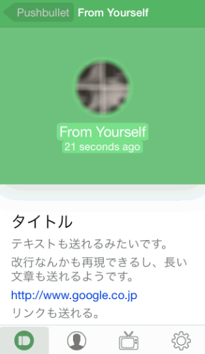 Pushbulletの面白い機能として、友達や知り合いも、コンタクトリストとして登録してもらえば、テキストメッセージやURLなどを送信できる点。