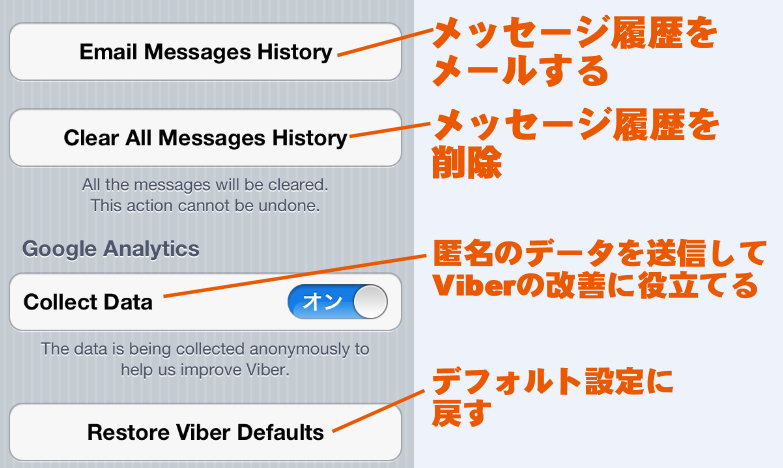 Restore Viber Defaultsは、設定データを初期化する場合に使います。