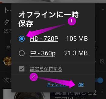 「HD(ハイビジョン)」の場合、高画質な動画をダウンロードできますがファイルサイズが大きくなります(約4~5倍)。