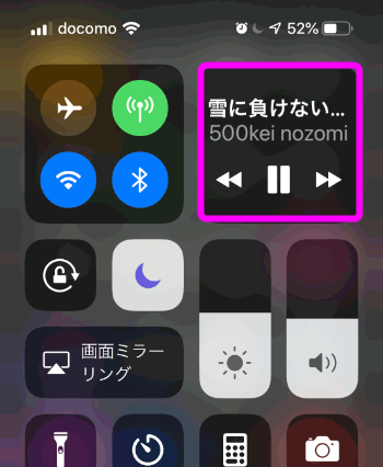 コントロールセンターを表示させると、再生ボタンなどが表示されます。