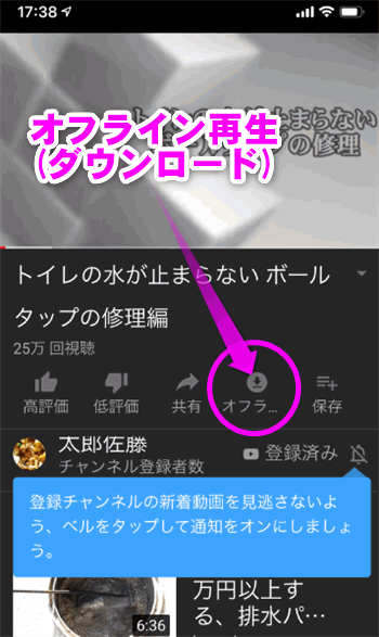 適当な動画を表示させたら、「オフライン」と記載されたアイコン(画像の丸で囲った部分)をタップします。
