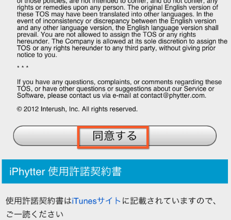 使用許諾契約書(英語)が表示されるので、「同意する」をタップします。