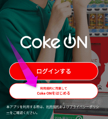 起動するとログインを求められます。まだアカウントを作成していない場合は、「利用規約に同意してCoke ONをはじめる」をタップします。
