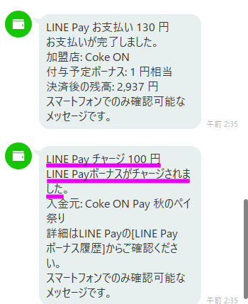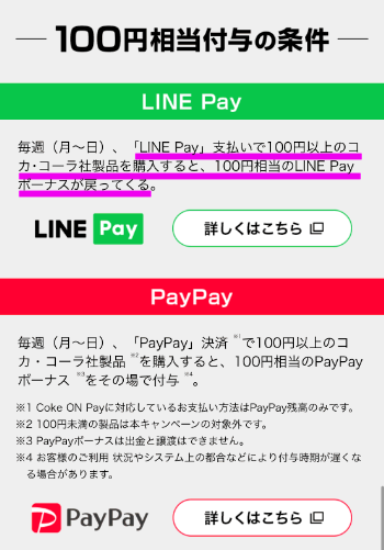 まれにキャンペーンを行っていて、Coke ONアプリにLINE PayやPayPayを登録してジュースを購入するとキャッシュバックされます。100円のジュースを購入すると100円がキャッシュバック??と思ったのですが