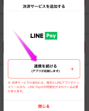 登録する電子マネーをタップします。今回は「LINE Pay」を登録してみます。