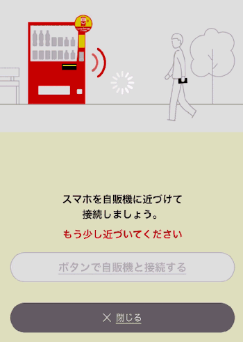 自動販売機から2m以上離れていたりすると、このように「もう少し近づいてください」と表示されてしまいます。この場合は、「販売中」の部分にスマホを近づけてください。