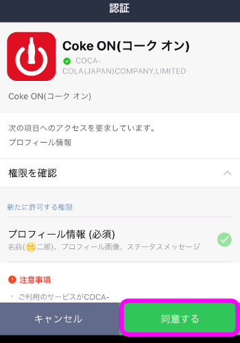 「Coke ON」への認証画面になるので、「同意する」をタップします。