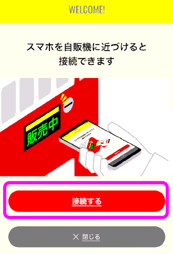自動販売機に近づくとこのような画面になるので、「接続する」をタップします。