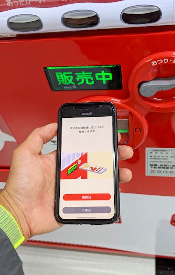 まずは「Coke ON」アプリを起動し、自動販売機の「販売中」と点灯している部分にスマホを近づけます。