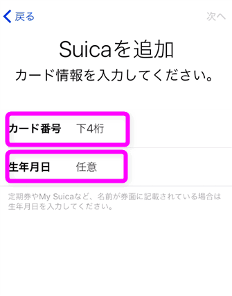 登録したいSuicaカードの裏側に記載されているカード番号の下4桁と、生年月日を入力します。