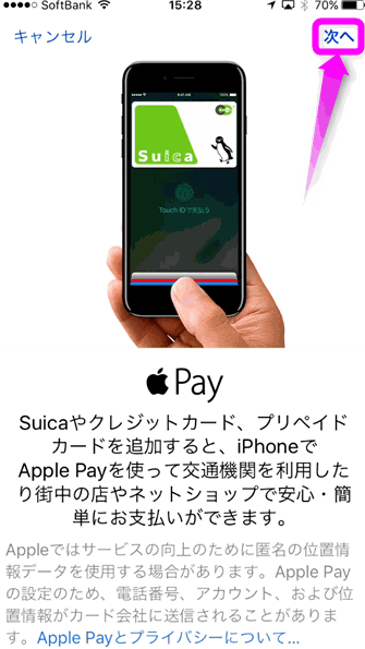 Apple Payについての簡単な説明が表示されるので、右上の「次へ」をタップします。