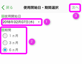 定期の開始日を選択し、②期間を選択します。