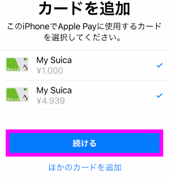 Apple Payの説明が表示されるので、「続ける」をタップします。