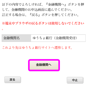 「金融機関へ」をタップすると、申し込み終了後、ゆうちょ銀行のHPに移動します。