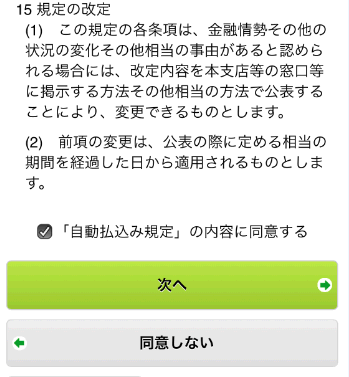「自動払込み規定」の内容に同意するにチェックを入れ、次へをタップします。
