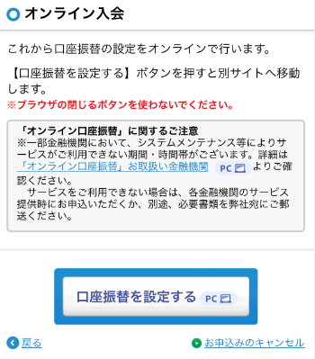 *申込み後、銀行のオンラインページが表示され、自動引き落としの手続きをする必要があります