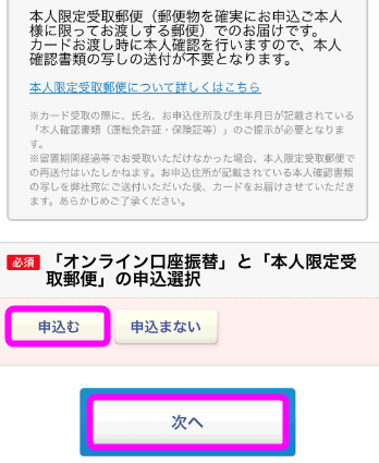 オンライン口座振替と本人限定受取郵便の申込みを選択し、次へをタップします。