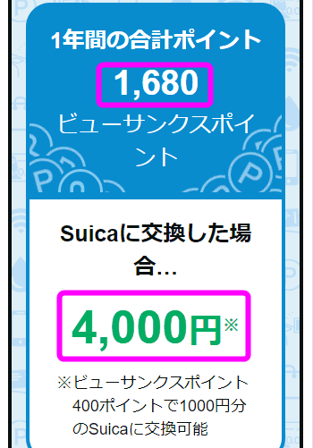 ポイントは400ポイント毎に1,000円分のSuicaと交換可能なのですが、1年間で1,680ポイントも貯まる事がわかりました。