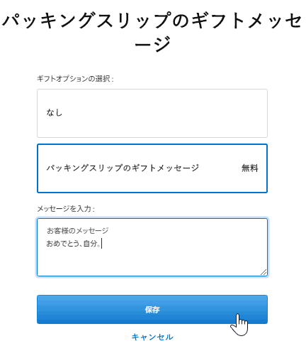 「バッキングスリップのギフトメッセージ」を選択し、メッセージを入力します。