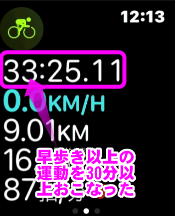 30分というのは、休憩(インターバル)を挟んでもOKです。ですが、何度か試したところ、30分ではリングが完成せず、だいたい33分ぐらいトータルで運動しないとエクササイズリングは完成しないようです。