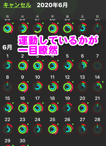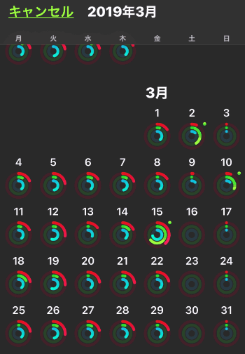 今まではリングで表示してどんな意味があるんだろう?と思っていたのですが、1か月単位で表示してみると、その月が運動していたかさぼっていたかが割と一目瞭然。