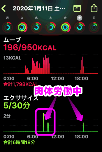 ワークアウトで記録しなくても、ある程度激しい肉体労働をすると自動的にエクササイズとして記録してくれるっぽい。