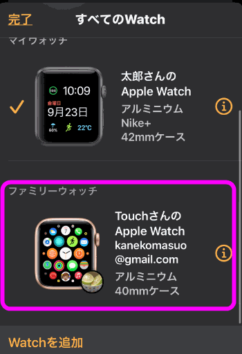 Watchアプリを開き、「すべてのWatch」を開き、「ファミリーウォッチ」にファミリ共有したApple Watchが表示されます。ここをタップしてチェックを入れます。