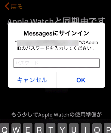 「Messagesにサインイン」と表示されるので、Apple IDのパスワードを入力し、OKをタップします。