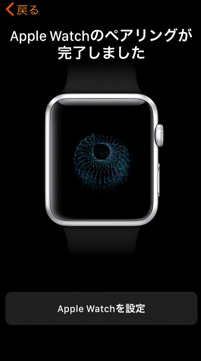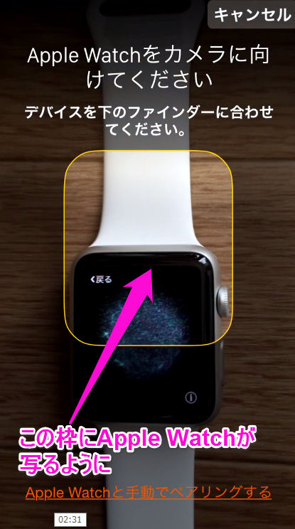Apple Watchの画面が、なにか渦巻く銀河というか小さな粒子の回転のようなアニメーション表示になるので、iPhone側のディスプレイの黄色い四角の中にApple Watchの画面が収まるように合わせます。