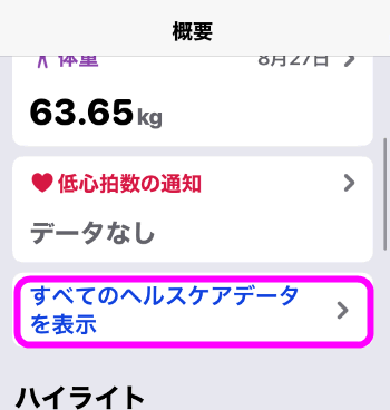 「ヘルスケア」を開き、「全てのヘルスケアデータを表示」を開きます。