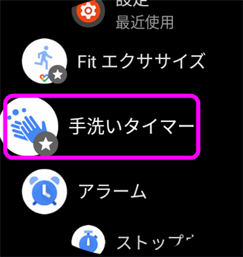 Wear OS By Googleで手洗いタイマーを立ち上げるには、再度ボタンを押してアプリ一覧を表示させ、その中にある「手洗いタイマー」を選択するだけです。