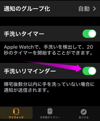 手洗いリマインダーとは、自宅に帰宅したら手を洗うようにApple Watchが通知してくれる機能。