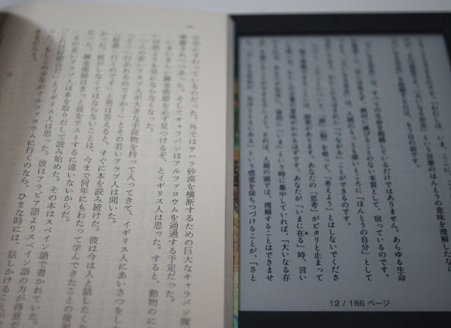 実際に離れてみると、あまり違いはないのですが、Kindleの方は文字がかすれているような感じに見えます。