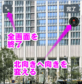右にあるコンパスのアイコンをタップすると、強制的に北の方向を向きます。